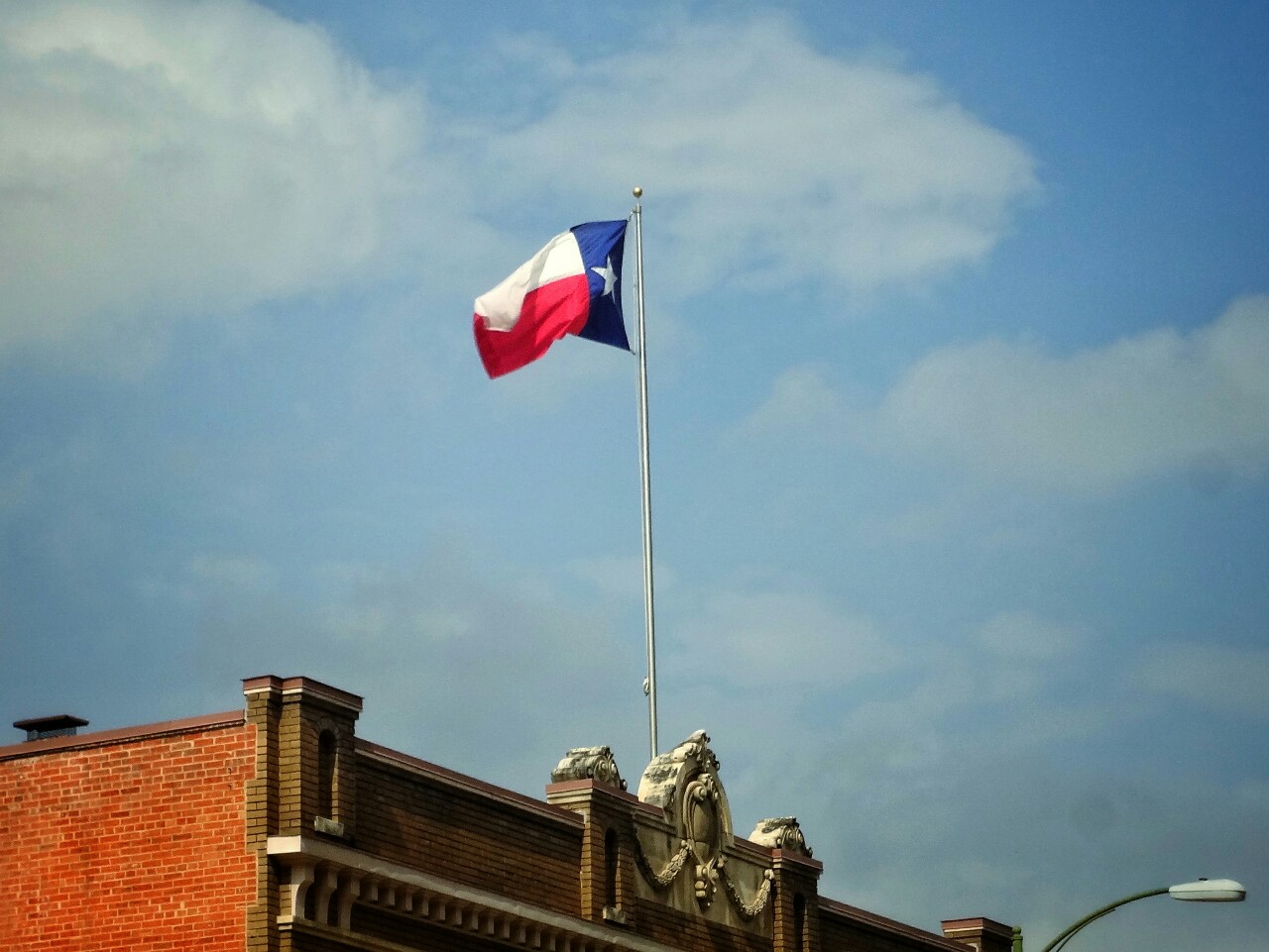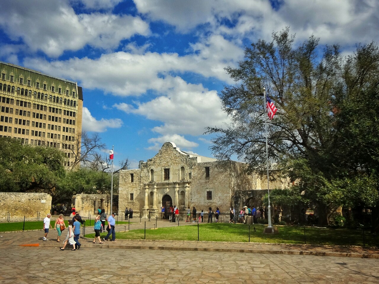 By the way, every American state has it's own flag. By the federal laws they can hang it anywhere, just to follow the rule, that it's always under national flag. Simply speaking, state flag must never fly solitary or above the flag of USA. Texas is of course an exception. It has a special status because of the period between liberation from Mexico and joining the United States. In that time it was for 10 years an independent country. And that's what Texans are very proud of even today. Texas revolution started in the mission of Alamo (photo below right.) Around Alamo later spread San Antonio.