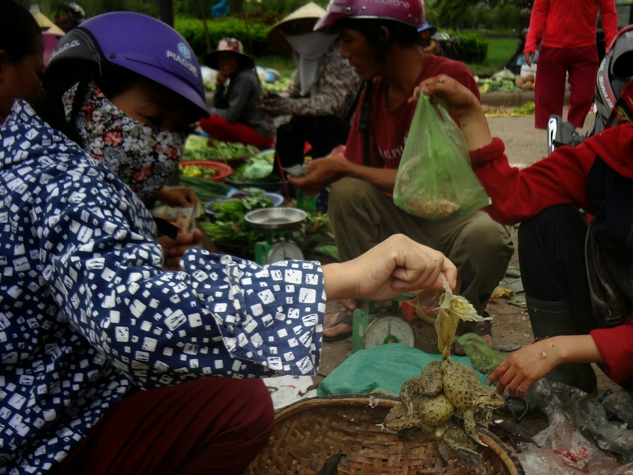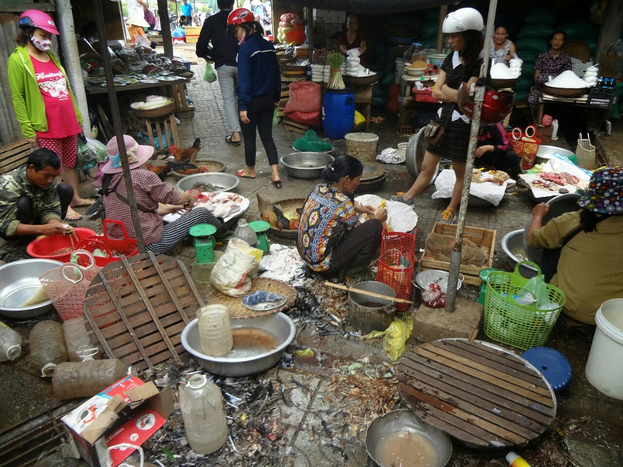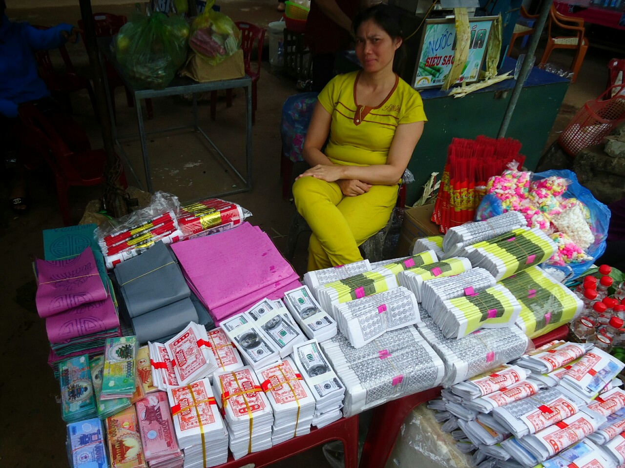 Naslednji postanek je bil, nekoliko nepričakovano, Dong Hoi. Tukaj sva se pobližje spoznala z budističnim obredom darovanja. Najprej se na ulico postavi hrana, bonboni, sadje in nepravi denar. Nekaj hrane in bonbone potem raztresejo po ulici, denar pa zažgejo. Tak denar namenjen darovanju lahko kupite kar na tržnici. Obred izvedejo enkrat na mesec.