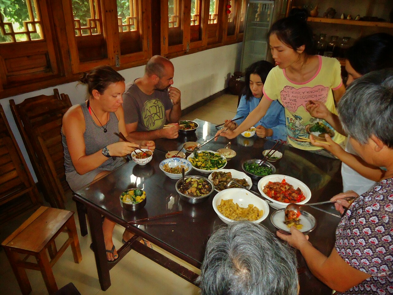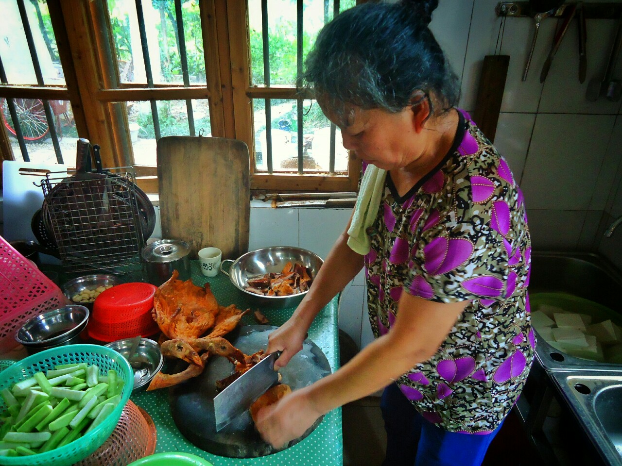 Dolžan sem vam narediti še nekaj luštov. Za zajtrk so bili običajno riževi rezanci z nečim. Na sliki desno z mesom in sladkim čilijem. Za kosilo in večerjo, pa je miza izgledala, kot na sliki desno. Vedno je bil na razpolago riž v neomejenih količinah, ki si si ga potem obogatil z različnimi nadevi. In ko vse skupaj zbašeš v krožnik dobiš sliko spodaj levo. Od zelenjave se veliko uporabljajo različne vrste buč, jajčevcev, paprik, čilijev, paradižnikov, navadnega in sladkega krompirja, koruze, arašidov in drugih oreškov... Od mesa pa prevladujejo bolj pernate živali. Spodaj desno kuharca ravno tamani neko raco :)