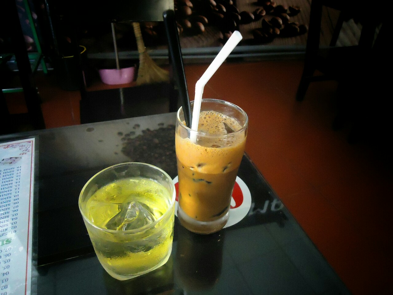 Glavni vietnamski izvozni artikel je kava. Navade pitja se zaradi vročega podnebja nekoliko razlikujejo od naših. Če v kavarni naročite Cà Phê (kava) boste dobili steklen kozarec z zelo močnim napitkom in veliko ledu (spodaj levo). Povsod dobite še brezplačen kozarec čaja. Če se čaj pije kot samostojna pijača je tudi močnejši kot v naši navadi. Na sliki spodaj desno sta kozarca čaja, ki sta skuhana z večjo količino rastline čaja, kot vode. Napitek je popolnoma neprosojen in ga ni mogoče piti, dokler ne dodajo ledu.
