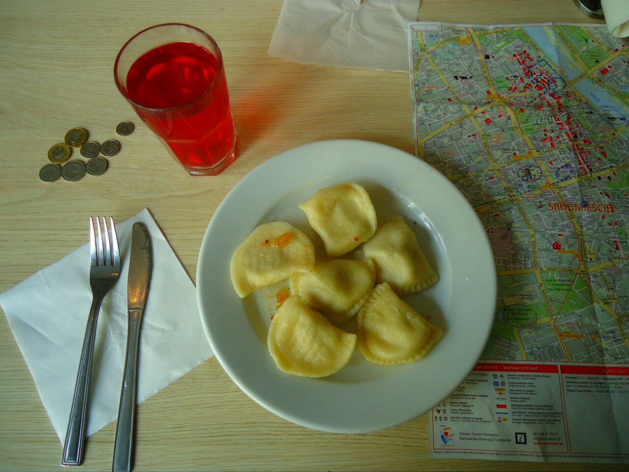 Na koncu se ne morem izogniti, da ne bi omenil še lokalnih sredstev za odpravljanje lakote, ki sem si jih privoščil. Spodaj so Pierogi in kompot. Kompot ima enak okus, kot pri nas, le da se tukaj smatra kot pijača. Posledično je vse skupaj samo veliko tekočine in ena češnja na dnu :)