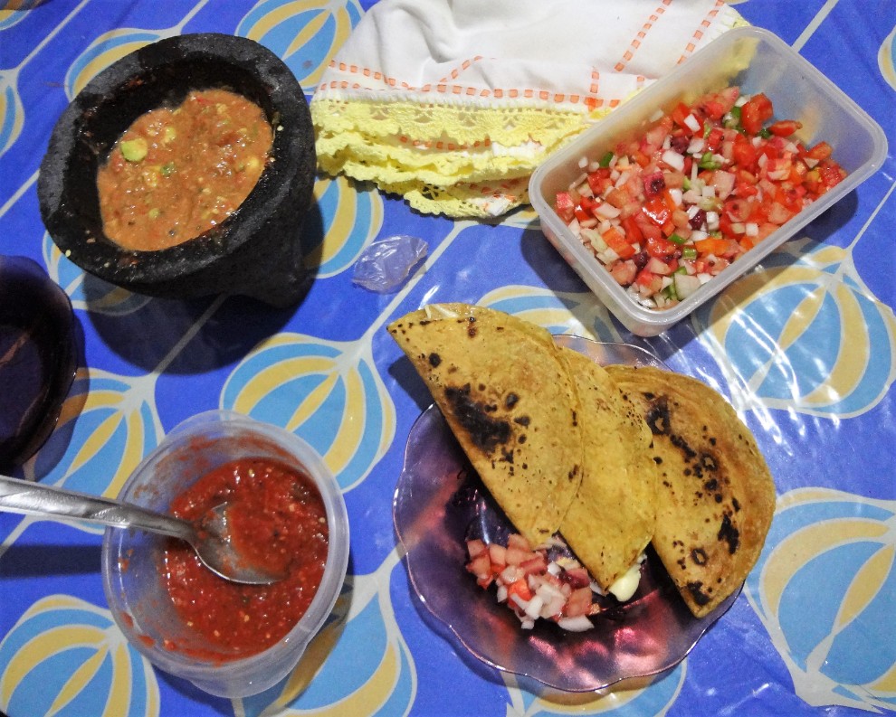 Vsekakor se oba, Aleš in jaz strinjava, da je Mehika kulinarično zelo bogata. Seveda, sem to pričakovala, saj sem tudi v Sloveniji kdaj pa kdaj zašla v kakšno mehiško restavracijo.Oba pa je vendarle presenetila ta prepletenost okusov. Tortilije, v katerih je užival predvsem Aleš, so pripravljene na tisoč in en način. Kruha skoraj ne poznajo. K vsakemu obroku pa seveda sodijo omake, takšne in drugačne. Zelo pekoče in ne pekoče (za njih). Jaz sem se zaljubila v njihovo salso, guacamole in pico de gallo. Vse te stvari sem se naučila pripraviti tudi sama. V manjšem mestecu Queretaro sva bila gostja pri Dolo. Punca je bila višek gostoljubnosti. Skrbela je, da nisva izpustila nobenega pomembnega kotička, da sva probala vse specialitete, se jih nekaj naučila pripraviti, nenazadnje pa smo imeli tudi pravi mehiški piknik.